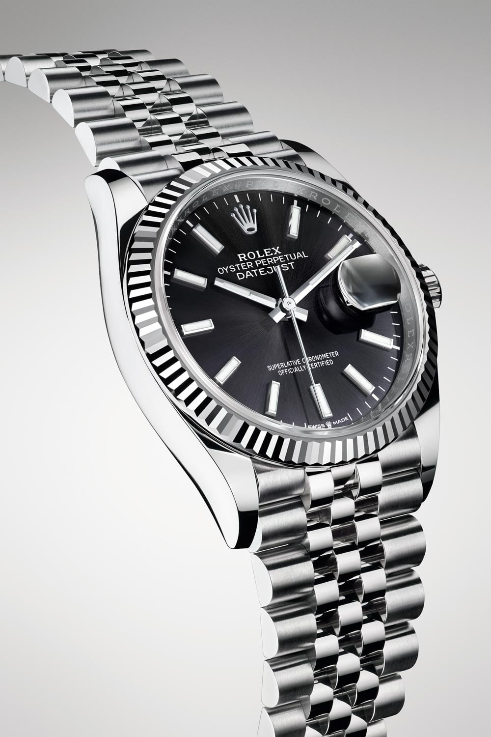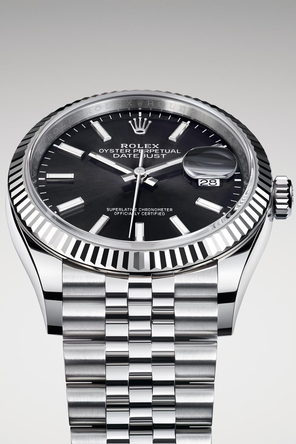 Ook twee nieuwe varianten van de Oyster Datejust 36, beide witte Rolesor-versies (een mix van Oystersteel en 18k witgoud). De eerste met zwarte sunray wijzerplaat en geribbelde lunette, de tweede combineert een witte parelmoeren wijzerplaat met 10 diamanten uurmarkeringen in 18k witgouden zettingen. De lunette is bezet met 52 diamanten. Zoals alle Rolex-horloges dragen de nieuwe Datejust 36-versies de Superlative Chronometer-certificering.