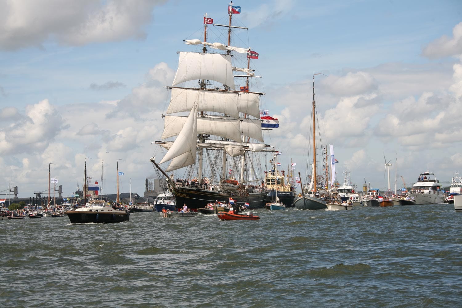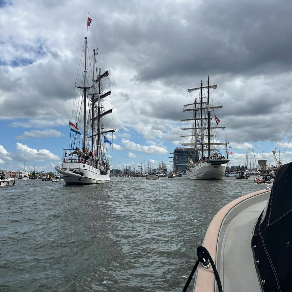 Wat deze Sail dagen echt bijzonder maakte, was de ontspannen gezellige sfeer aan boord – een contrast met de ongekende drukte op het IJ. Buiten de boot was het een indrukwekkend schouwspel van talloze schepen en boten, van luxe jachten tot kleine sloepen, vol mensen die allemaal hun eigen plek zochten in dit nautische spektakel. Harry slaagde er bovendien meesterlijk in om de boot soepel te laveren tussen het bonte en soms chaotische verkeer – tussen groot en klein, duur en eenvoudig, met schippers van alle niveaus.