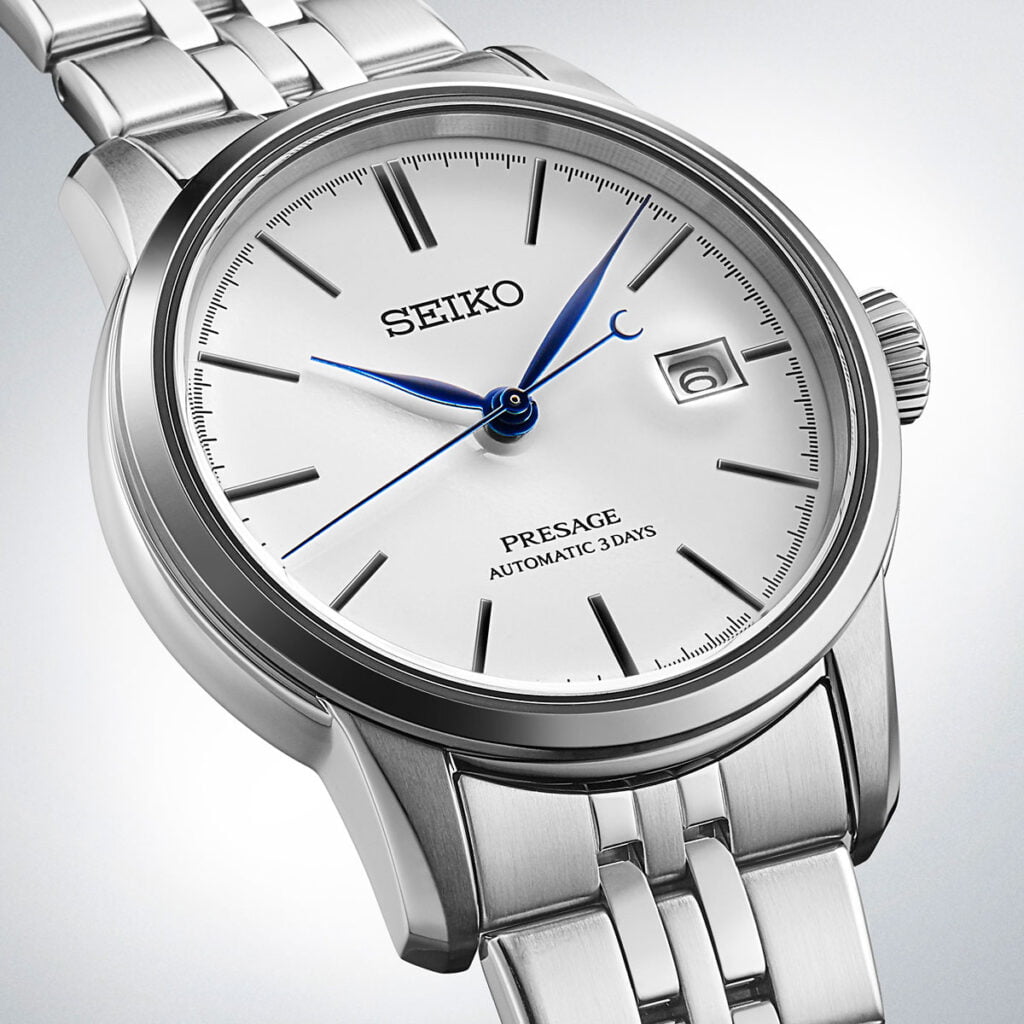 Het knisperend witte emaille van de Presage is tot leven gebracht door Seiko’s meester-ambachtsman Mitsuru Yokosawa, die de kunst beheerst om een vlekkeloos laagje glazuur van slechts 0,1 mm dikte aan te brengen. De grijze, metalen staafindexen van het vernieuwde wijzerplaatdesign laten alle ruimte aan het emaille om letterlijk en figuurlijk te schijnen, de blauwe wijzers geven een subtiel contrast. Kracht door eenvoud en perfectie.