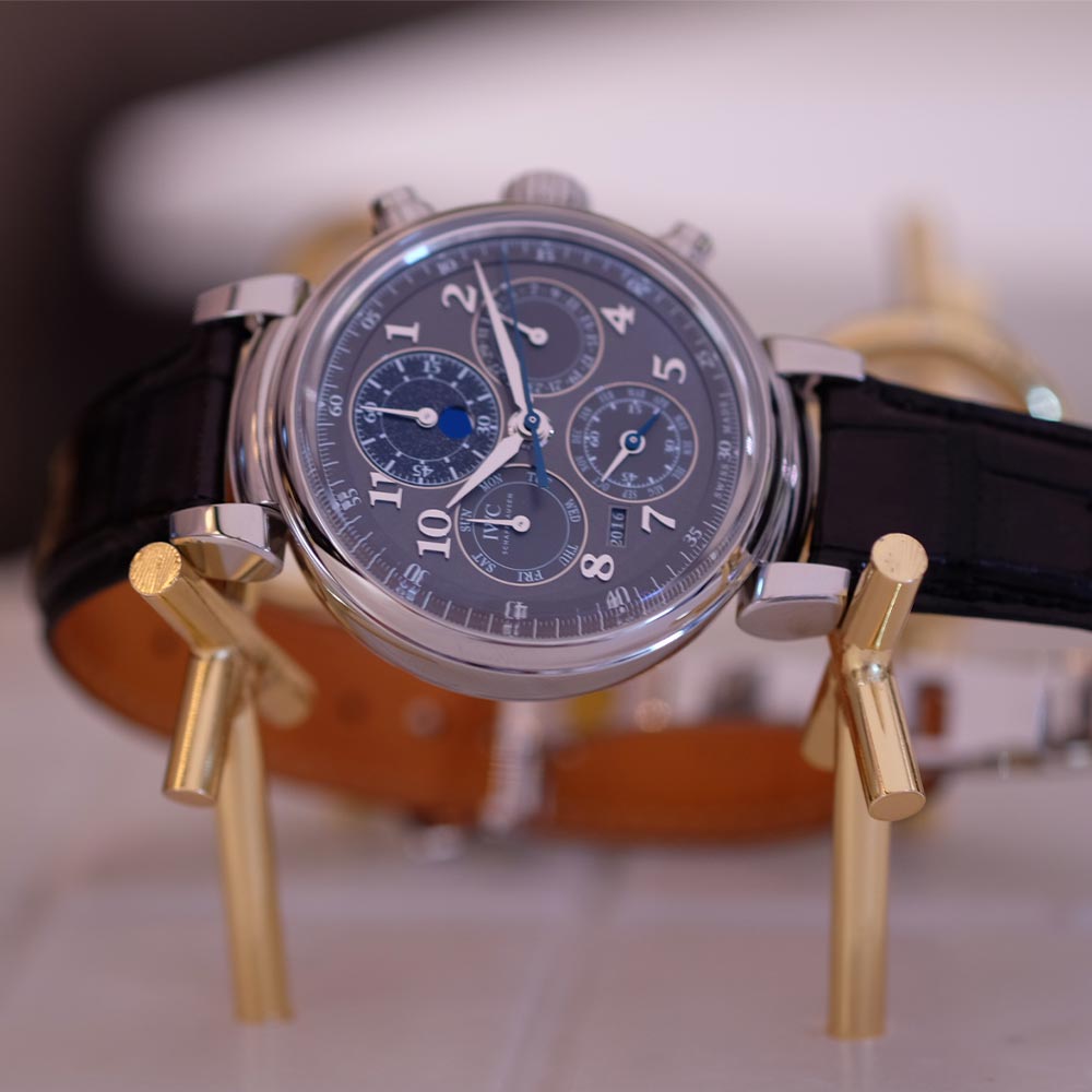 The new IWC Da Vinci is inspired by its 1980’s predecessor. Kurt Klaus wrote watchmaking history in 1985 with his perpetual calendar and the 2017 successor follows the original. The case is now 43mm instead of 41.5mm and the movement is entirely new. It combines a perpetual calendar with a flyback single dial chronograph positioned at 12 o’clock. Because of the flexible lugs the firm and quite tall watch embraces the wrist very comfortably. It doesn’t feel like a 43mm watch at all.