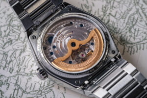 Daarnaast past de toch wat drukke stedenring heel goed in de kast dankzij het ontbreken van een lunette en het formaat. De stalen kast meet een keurige 41 millimeter in doorsnee.