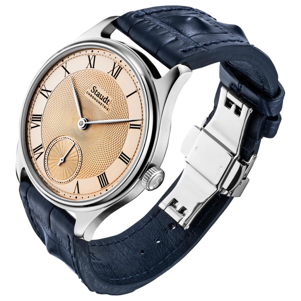 Achter de wijzerplaat tikt een handopwindkaliber dat is gebaseerd op de klassieke Unitas-architectuur, maar door Staudt opnieuw is vormgegeven en volledig met de hand is gedecoreerd. De afwerking omvat onder meer chatons, thermisch geblauwde schroeven, een driekwart-platine en een zwanenhalsregulering. Het uurwerk is bovendien roségoud verguld, wat de warme glans van het mechaniek subtiel laat terugkomen in het totaalbeeld. Van de Guilloché Salmon Gold worden slechts 25 individueel genummerde exemplaren gemaakt, met daarnaast de mogelijkheid voor een bijzonder vorm van personalisatie: op verzoek kan een eigen motief, zoals een familiewapen, met de hand in de massief gouden wijzerplaat worden gegraveerd voordat het guilloché-patroon wordt aangebracht.