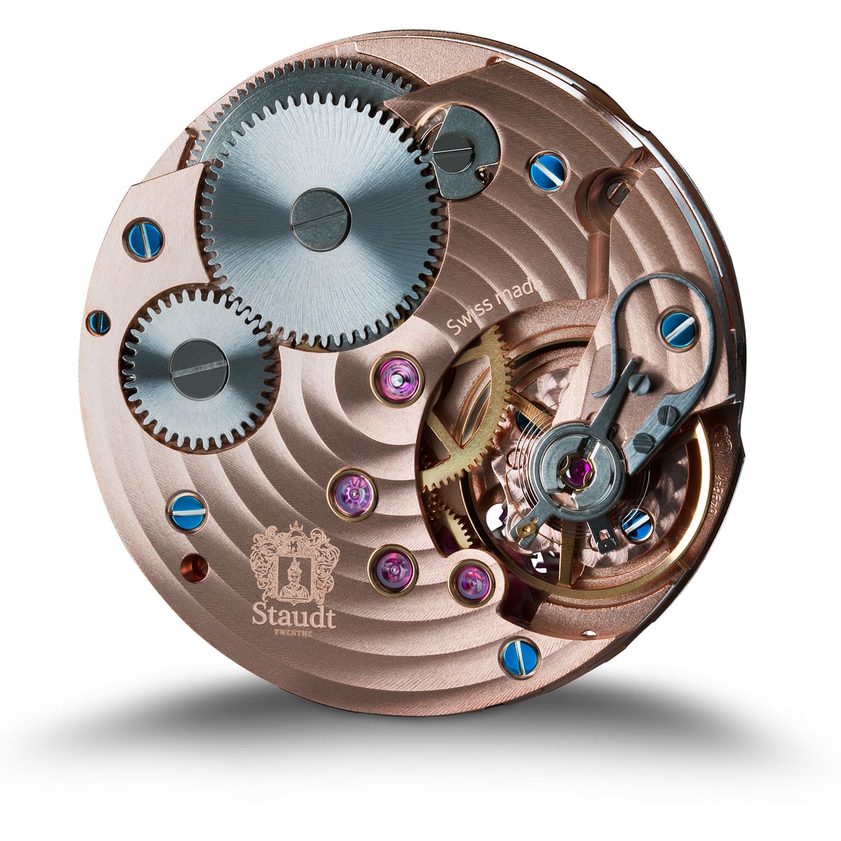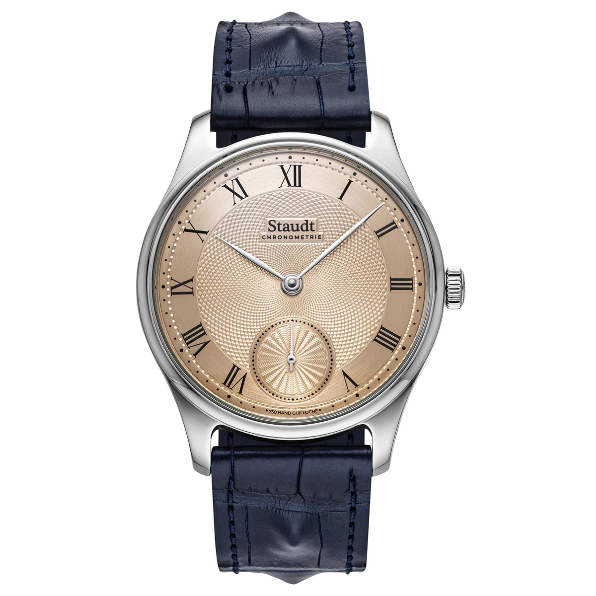 Achter de wijzerplaat tikt een handopwindkaliber dat is gebaseerd op de klassieke Unitas-architectuur, maar door Staudt opnieuw is vormgegeven en volledig met de hand is gedecoreerd. De afwerking omvat onder meer chatons, thermisch geblauwde schroeven, een driekwart-platine en een zwanenhalsregulering. Het uurwerk is bovendien roségoud verguld, wat de warme glans van het mechaniek subtiel laat terugkomen in het totaalbeeld. Van de Guilloché Salmon Gold worden slechts 25 individueel genummerde exemplaren gemaakt, met daarnaast de mogelijkheid voor een bijzonder vorm van personalisatie: op verzoek kan een eigen motief, zoals een familiewapen, met de hand in de massief gouden wijzerplaat worden gegraveerd voordat het guilloché-patroon wordt aangebracht.