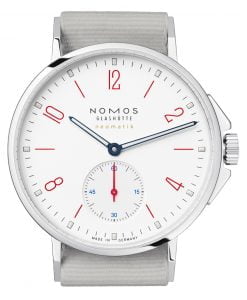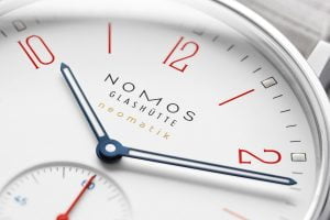 Against a bright white background, red numerals command your attention. They form a playful contrast with the blued hands, which are set in motion by the neomatik caliber DUW 3001. Despite that this movement is very slender, with a height of only 3.2mm, it also remains a very robust movement, that delivers consistent precision even in more challenging conditions. This is thanks to for example the full bridge over the balance wheel. The finishing is, of course, second-to-none as one come to expect from the brand from Glashütte, with the blued screws adding not only a dash of color, but also a nice reference to the blued hands on the dial side of the watch.