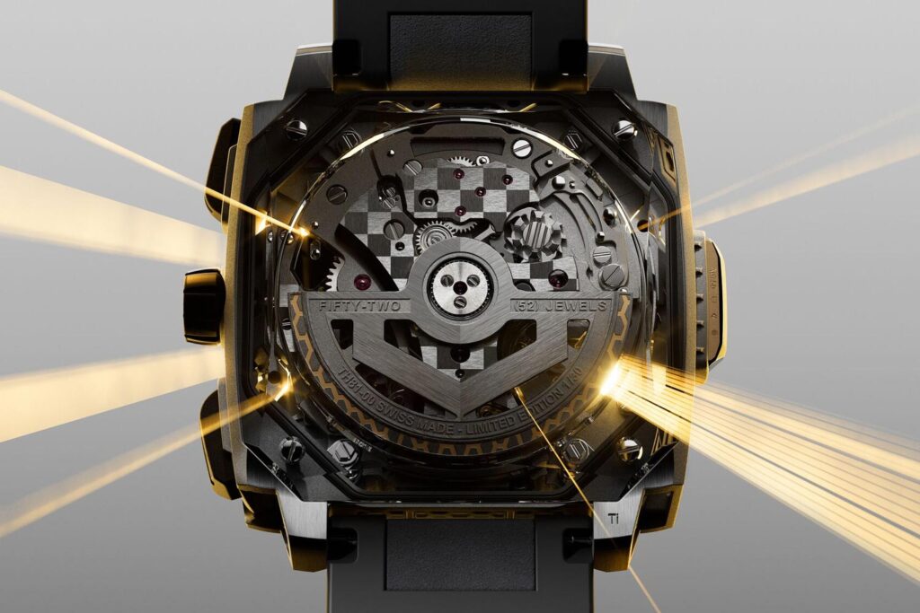 Het proces zelf is uniek: in plaats van materiaal weg te frezen uit een massief blok, wordt bij SLM laag voor laag titaniumpoeder gesmolten met een krachtige laser, gestuurd door een 3D CAD-model. Zo ontstaat de complexe, driedimensionale vorm die de Monaco Air 1 zijn futuristische uitstraling geeft. De 41 mm kast heeft strakke, gespierde lijnen en een exoskelet-achtig ontwerp dat een honingraatstructuur omsluit, geïnspireerd op de roosters van hypercar-motoren. De combinatie van Grade-5 titanium en 2N geelgouden componenten onder de bezel creëert een perfect huwelijk tussen edelmetaal en hightech materiaal, terwijl het DLC-gecoate titanium contrast en diepte toevoegt.
