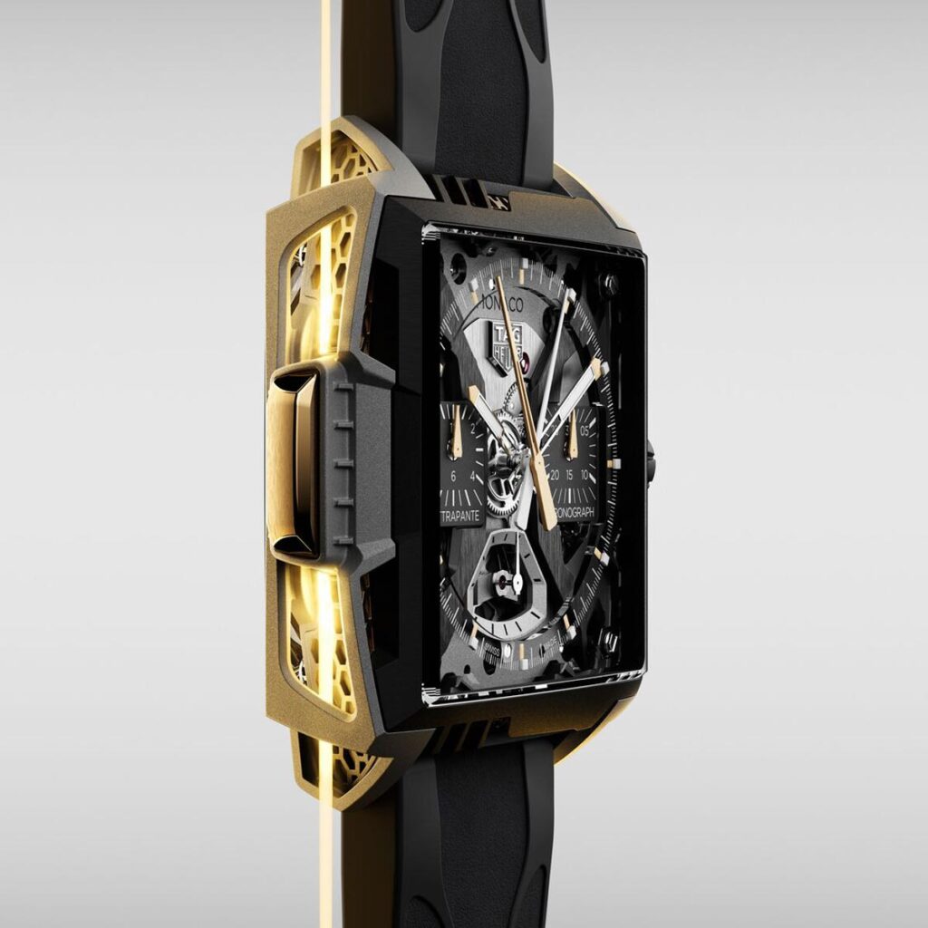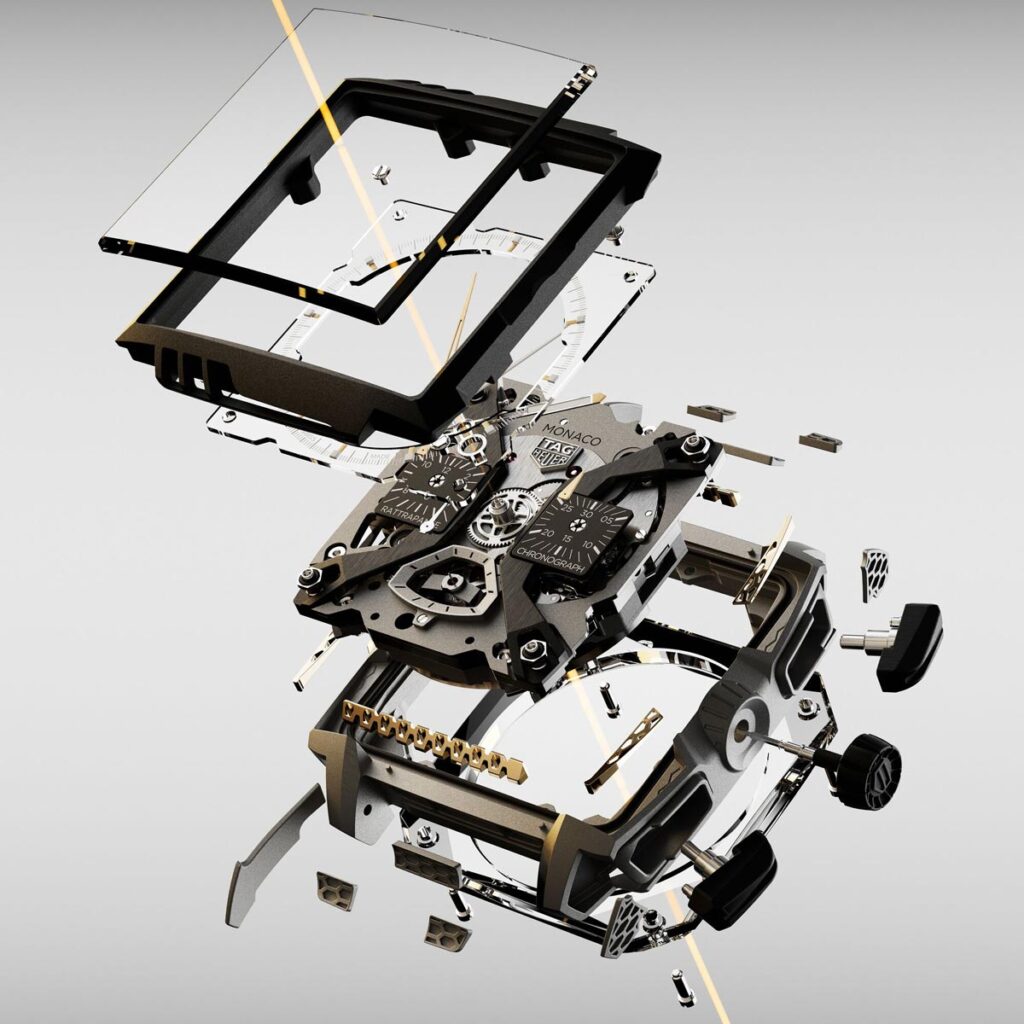 De geavanceerde techniek achter de Monaco Air 1 zien we direct in de kastvorm. De kast van ultralicht Grade-5 titanium werd vervaardigd met een baanbrekende methode genaamd Selective Laser Melting (SLM). Deze productiemethode wordt doorgaans toegepast in de luchtvaart, medische technologie en de automotive-industrie om complexe componenten te maken. TAG Heuer LAB, het innovatiecentrum van het merk, paste SLM aan voor horlogebouw, waardoor ontwerpers en ingenieurs vormen konden realiseren die met traditionele technieken onmogelijk zouden zijn. Het resultaat is een kast die lijkt te zijn uitgehold, alsof ze is gevormd voor optimale luchtstroom en snelheid, met een gewicht van slechts 85 gram inclusief enkele solide gouden onderdelen.