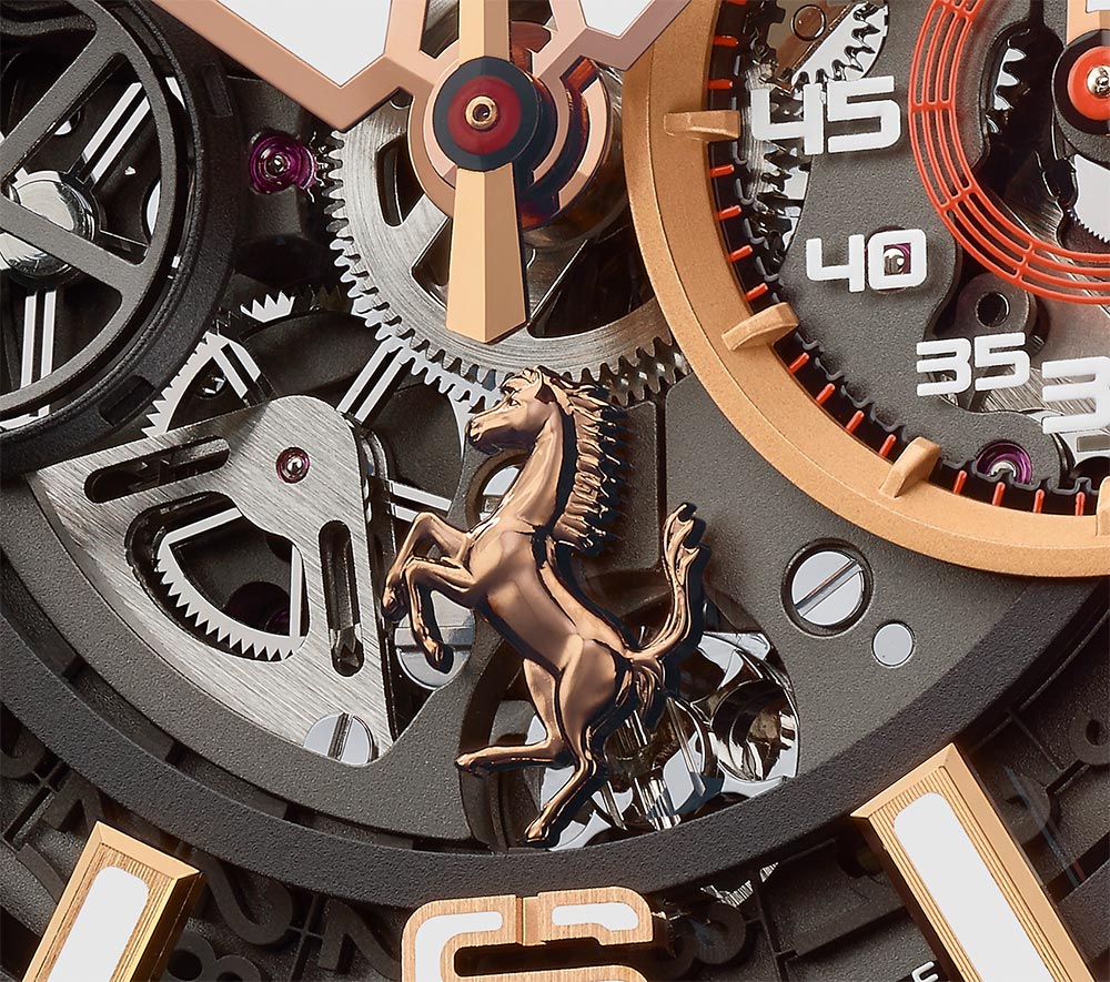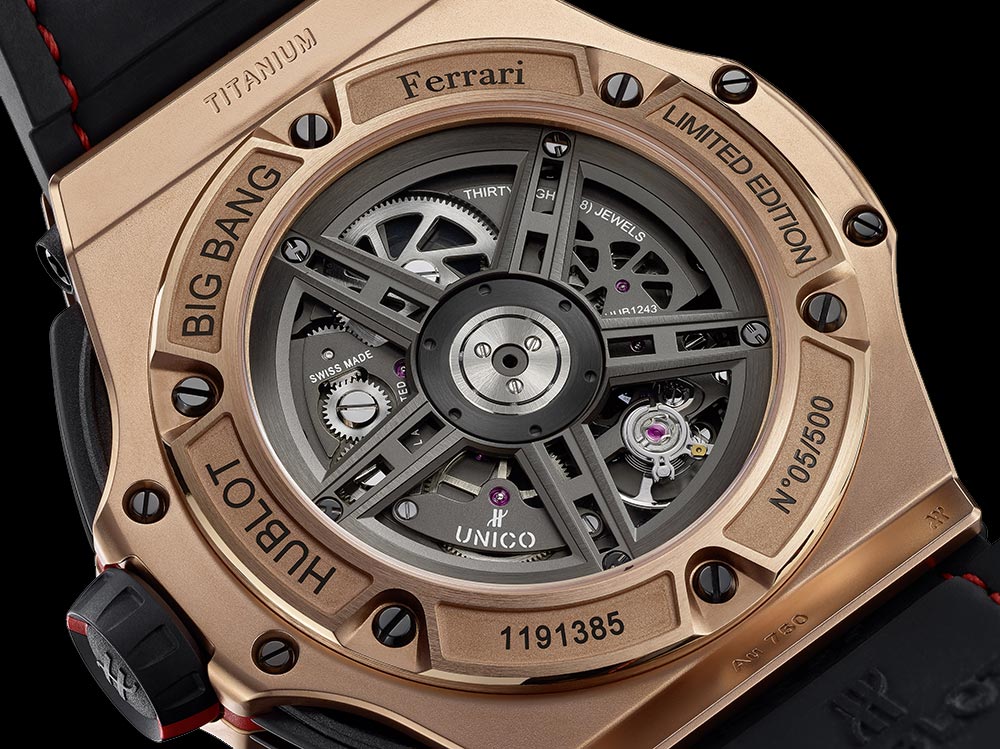 Het horloge heeft een sterke driedimensionale constructie waardoor het mechanisme van binnen kan schitteren en ook sterke overeenkomsten vertoont met de manier waarop de V8 turbomotor van de Ferrari 488 het starring middelpunt van de sportwagen is. De nieuwe 45 mm Big Bang Ferrari zal verkrijgbaar zijn in titanium (1.000 exemplaren), King Gold (500 exemplaren), carbon (500 exemplaren) en een aantal onbeperkte versies die titanium, King Gold en carbon op verschillende manieren combineren. Binnenin deze horloges tikt een automatisch chronograaf uurwerk met kolomwiel, een saffierschijf met datumaanduiding en een gangreserve van 72 uur.