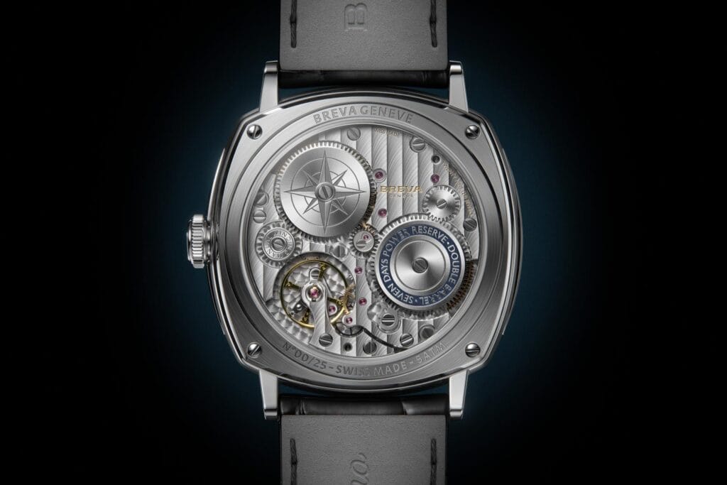 Beide horloges worden aangedreven door een uitzonderlijk handopwindbaar uurwerk, speciaal ontwikkeld voor BREVA GENEVE door meesterhorlogemaker Jean-François Mojon en zijn onafhankelijke manufactuur, Chronode. Het exclusieve kaliber, voorzien van 29 juwelen en een frequentie van 3 Hz, onderscheidt zich door een zeldzame driedubbele retrograde configuratie: uren, seconden en een dubbele schaal voor de 7-daagse gangreserve. Het is een technisch hoogstandje dat niet vaak wordt aangetroffen binnen de wereld van de haute horlogerie.