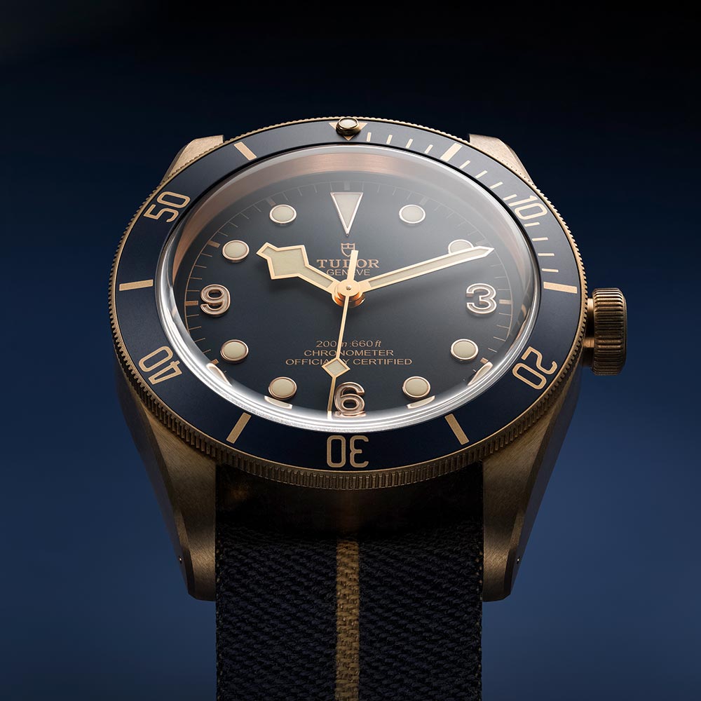 Tudor revived the Heritage line in 2010 with the launch of the Chrono model, a reinterpretation of its first chronograph from the 1970s. An interesting creative approach was used to design this series: Rather than replicate the original watches, the past was just hinted at in little bits using the most emblematic elements of the company history. The models, when put in the spotlight, seem to have survived all the temporal clashes between the past, present, and future, and now boast an amazing contemporary look. And what an excellent prospect, one that is most representative of the neo-vintage trend in watchmaking! For Bucherer, this Heritage Black Bay Bronze Blue is an opportunity to rediscover the Tudor diving watches.