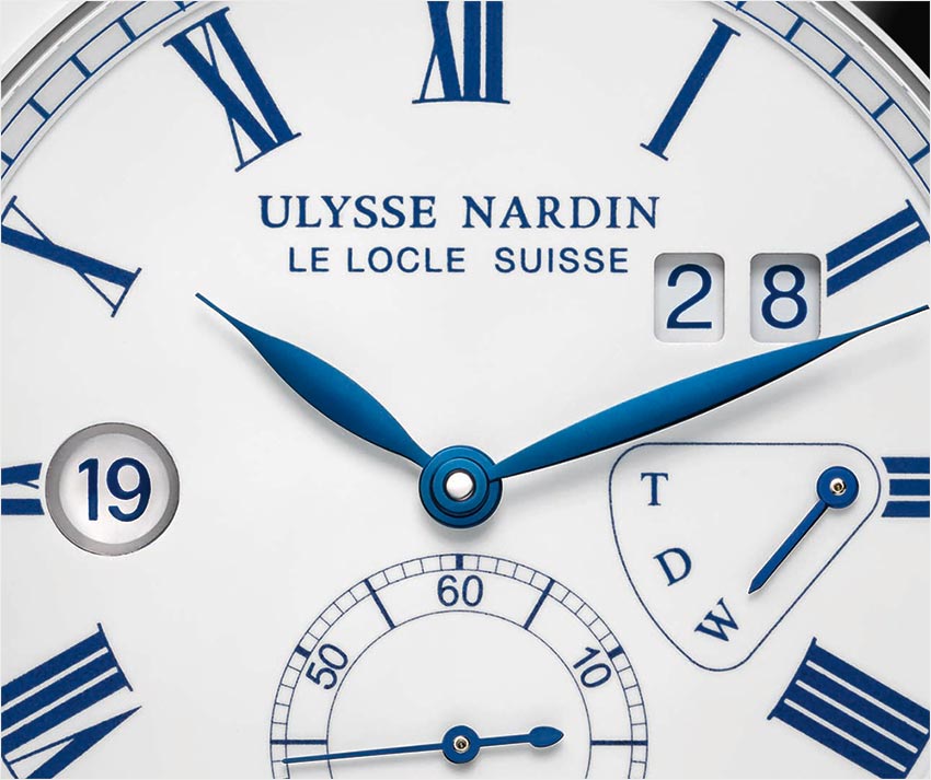 Part of the Swiss watchmaker’s Classic collection, this Dual Time with a white enamel dial is the ideal traveling companion. Equipped with the patented Dual Time zone feature, it is instantly adjustable both forwards and backwards with a mere push of a button. These buttons feature at the 8 and 10 o’clock positions. When pressed, the pushers adjust the hour hand to a different time zone while the home time indicator at 9 o’clock continues its 24-hour cycle. An impressive mechanical complication that is very easy to use – one of Ulysse Nardin’s guiding ideals. The time and date setting is another example of the watchmaker’s perpetual quest for innovation in action. The selector is integrated in the crown allowing to change settings without pulling and pushing the crown.