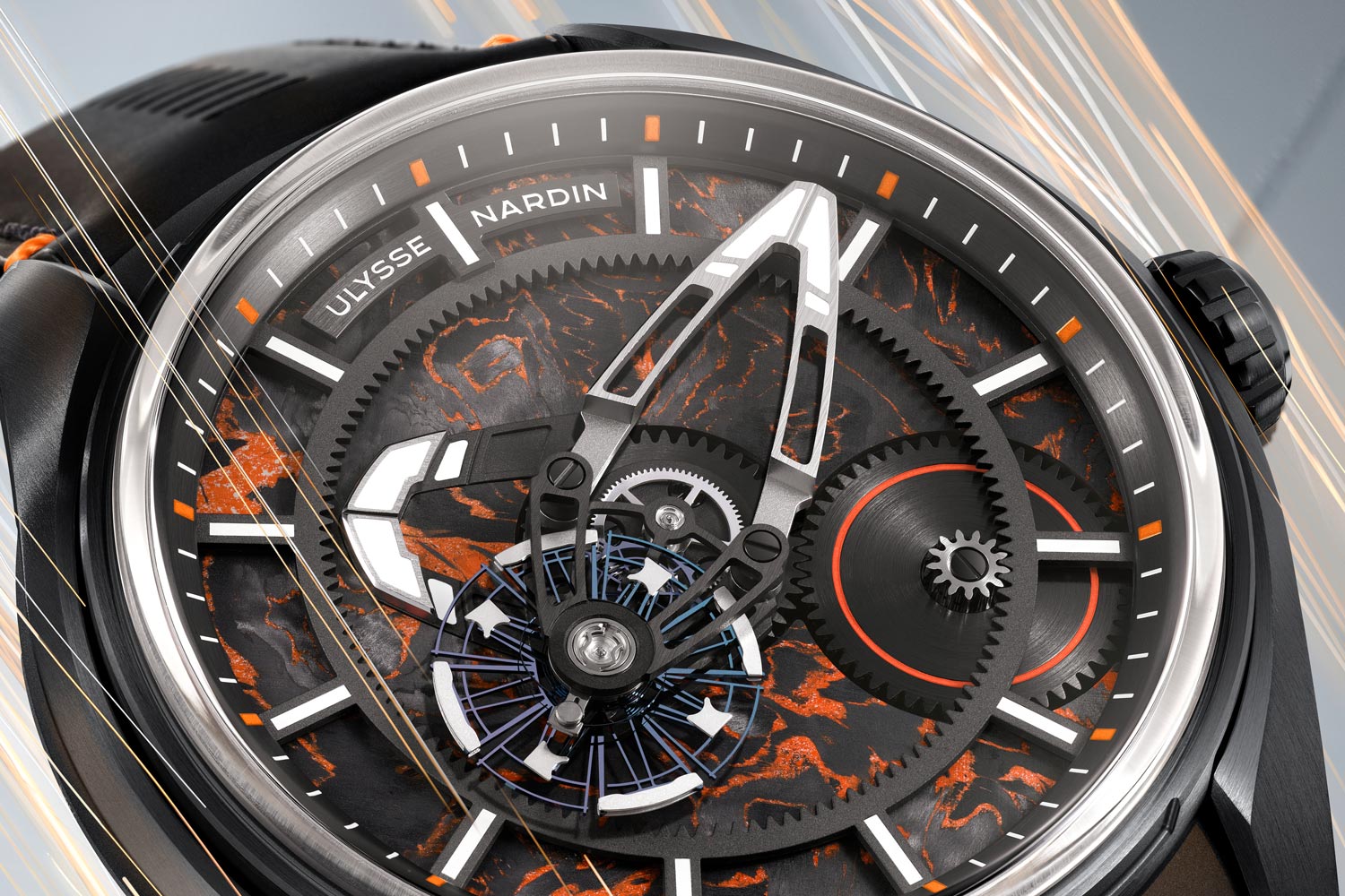 Voor deze editie is de urenschijf uitgevoerd in Carbonium, een gepatenteerd composietmateriaal op basis van koolstofvezels uit de luchtvaartindustrie. In tegenstelling tot klassiek geweven carbon heeft Carbonium een onregelmatige, organische structuur. Hier is het materiaal gecombineerd met oranje epoxy, wat zorgt voor een uitgesproken oppervlak. Een oranje Super-LumiNova-ring rond de minutencarrousel en witte lichtgevende accenten op indexen en bruggen verbeteren de leesbaarheid.