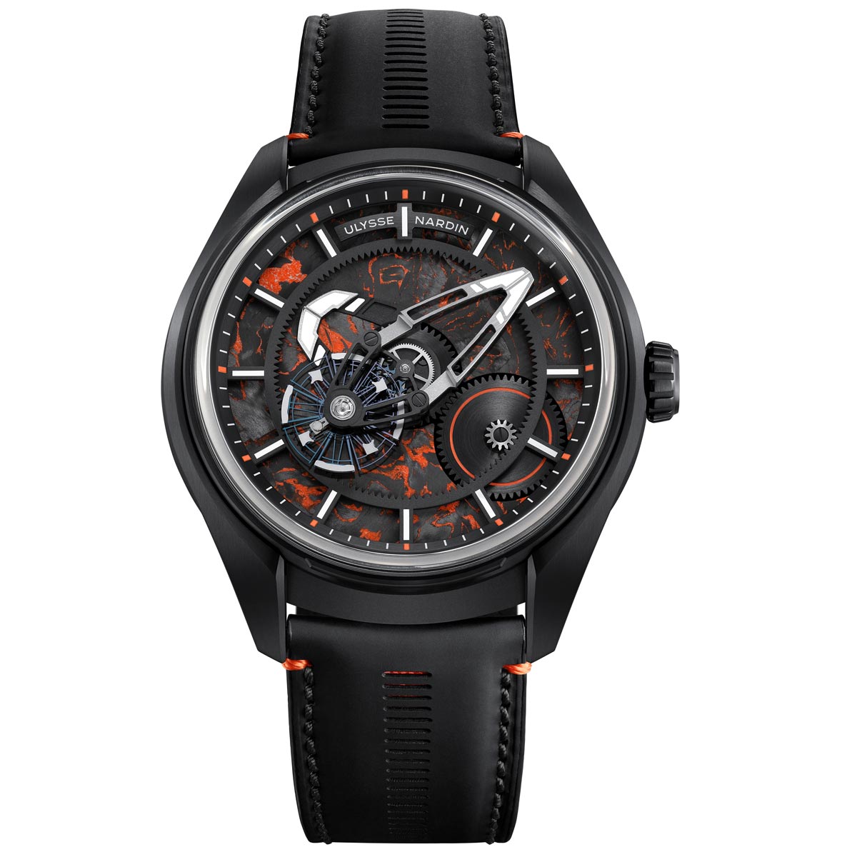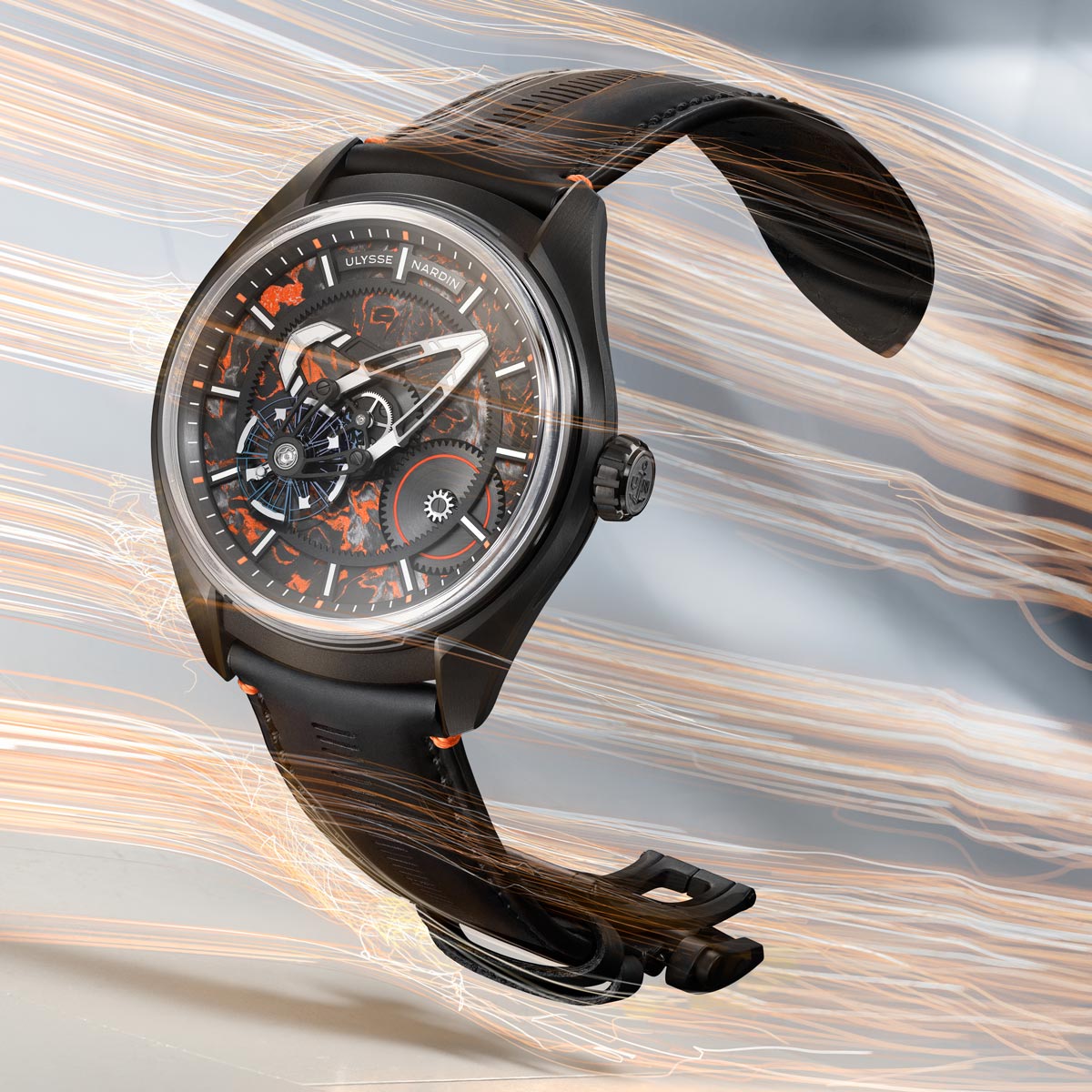 Voor deze editie is de urenschijf uitgevoerd in Carbonium, een gepatenteerd composietmateriaal op basis van koolstofvezels uit de luchtvaartindustrie. In tegenstelling tot klassiek geweven carbon heeft Carbonium een onregelmatige, organische structuur. Hier is het materiaal gecombineerd met oranje epoxy, wat zorgt voor een uitgesproken oppervlak. Een oranje Super-LumiNova-ring rond de minutencarrousel en witte lichtgevende accenten op indexen en bruggen verbeteren de leesbaarheid.