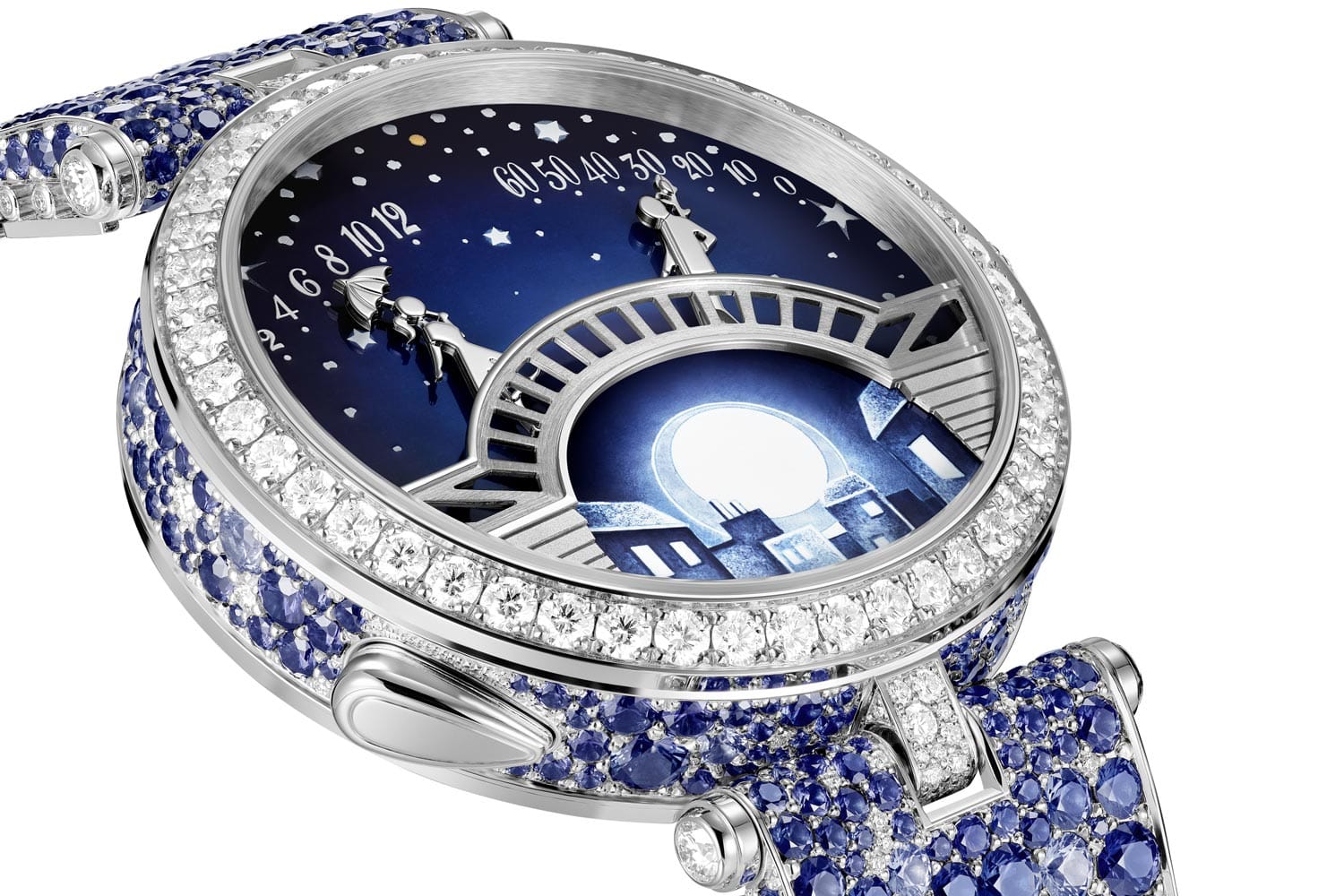 In 2010 onthulde Van Cleef & Arpels het eerste horloges in de Poetic Complications collectie. Sindsdien vertelt het Pont des Amoureux horloge het verhaal van een man en een vrouw die elkaar ontmoeten op een brug in Parijs. In deze automaton met een dubbele retrograde beweging markeren de twee geliefden respectievelijk uren en minuten, terwijl ze langzaam naar elkaar toe bewegen voor een kus om middernacht en op het middaguur. Voor een betoverende drie minuten lijkt de tijd stil te staan, voordat de figuren weer uit elkaar gaan om opnieuw de tijd aan te geven. Om dit poëtische moment naar wens te beleven, biedt een animatie op aanvraag de mogelijkheid om de scène twaalf seconden lang opnieuw af te spelen. In de nieuwe collectie van 2025 wordt het verhaal verrijkt met vier nieuwe horloges met verfijnde armbanden die het paar tonen in landschappen die verschillende momenten van de dag oproepen. De wijzerplaten stralen subtiele kleuren uit die de dageraad, ochtend, schemering en maanlicht weergeven.