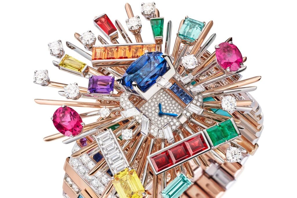 Eén van de blikvangers is de Gioco di Forme e Colori, een secret watch met een afneembare broche als wijzerplaatbedekking. In het midden schittert een 12,34-karaats tanzaniet, omlijst door gouden zonnestralen geïnspireerd op de zon in Rome. De explosie aan kleur is afkomstig van kleurrijke edelstenen als smaragden, saffieren, robijnen en granaatstenen, geslepen in verschillende vormen.
