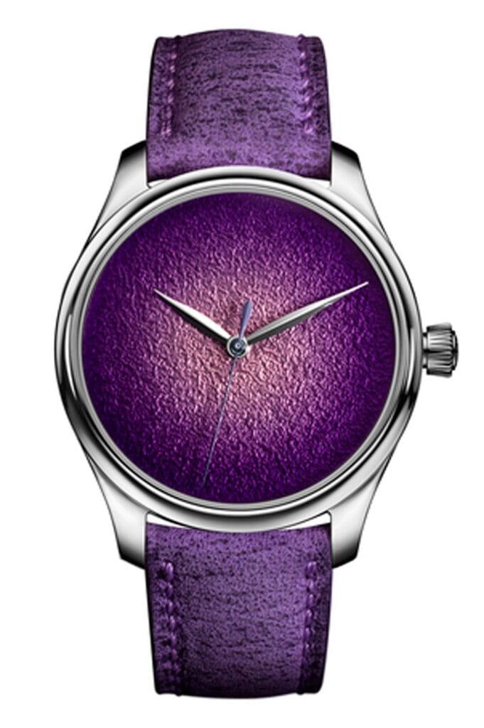 Trouw aan zijn erfgoed van vakmanschap, heeft H. Moser & Cie. zijn iconische fumé-wijzerplaten opnieuw geïnterpreteerd door de voorouderlijke kunst van het emailleren te benadrukken. Deze expertise is opnieuw bekeken met een eigentijdse benadering en dit heeft geleid tot een originele, heldere en levendige tint, waarvan de gehamerde textuur een betoverend lichtspel creëert. De kleur is Purple Haze, een tint die bijzonder moeilijk te bereiken is. Om de schoonheid van de paarse wijzerplaat te benadrukken, heeft H. Moser & Cie. gekozen voor zuiverheid. Zonder merknaam, logo of indexen komt de Purple Haze wijzerplaat volledig tot zijn recht.