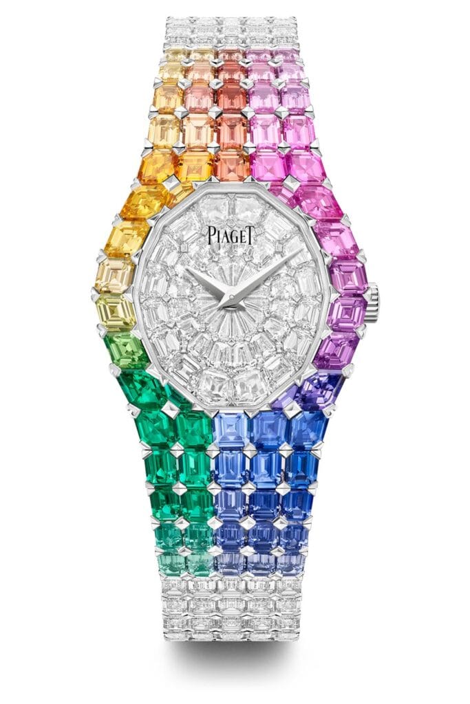 Er zijn merken die horloges maken, merken die juwelen ontwerpen en merken die beiden beheersen. Zo’n merk is Piaget, dat al ruim zes decennia creaties brengt die zowel horloge als juweel zijn. Horloges als de Rainbow Aura ,die laat zien hoe Piaget zich sinds de jaren zestig heeft bekwaamd in het zetten van edelstenen. De witgouden Rainbow Aura straalt met een regenbooggradiënt van saffieren, smaragden, chrysoberylen, tsavorieten en diamanten. De pot met goud aan het eind van de regenboog is het ultradunne Manufacture Piaget 430P uurwerk met handopwinding.