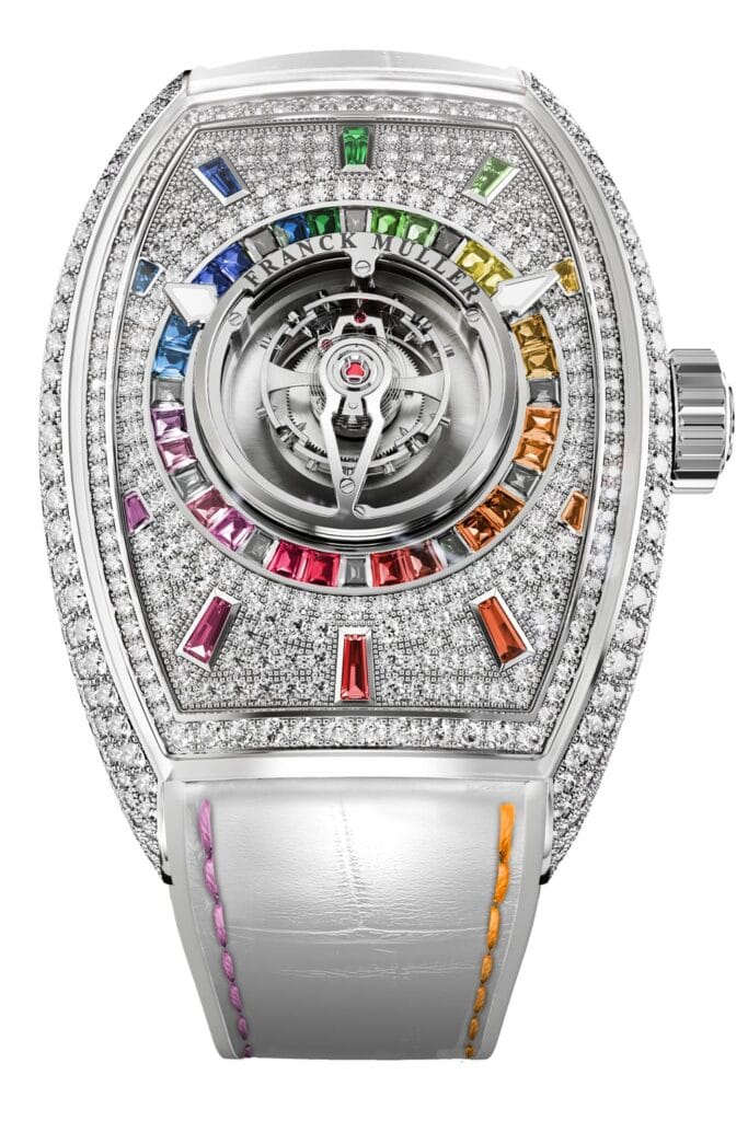 Franck Muller is er meester in om technische complicaties en artistieke expressie in een horloge te combineren. De Curvex CX Grand Central Tourbillon Rainbow is zo’n meesterwerk. In dit model verlaat de tourbillon zijn plek in de schaduw om centraal op de wijzerplaat de show te stelen, op een plek waarvoor de architectuur van het uurwerk volledig opnieuw moest worden ontwikkeld. Elk horloge van deze collectie is versierd met een buitengewone reeks edelstenen, van diepblauw en levendig groen tot gloeiende oranje en vurige rode tinten. De schittering zet zich voort in een kast die is geplaveid met diamanten en die schittert bij elke beweging van de pols.