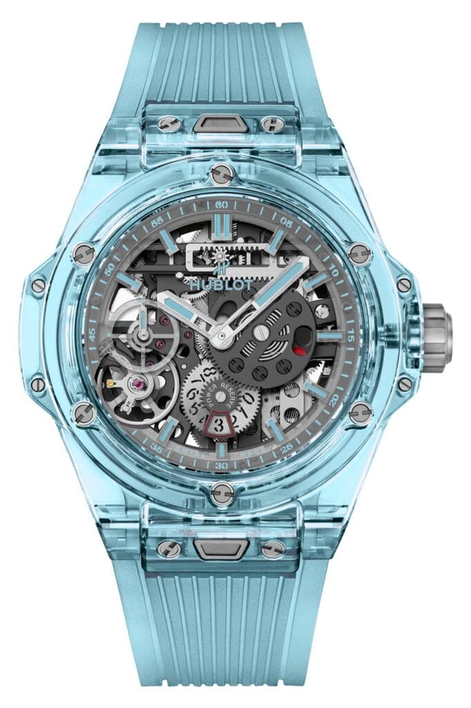 Sinds de eerste Big Bang in saffier uit 2016 en de eerste gekleurde saffierkast het jaar daarop, heeft Hublot het tot zijn missie gemaakt om saffier en zijn vele potentiële vormen te verkennen en te exploiteren. Eenvoudig is dat niet, want elke kleur vereist het vinden van de precieze formule en het aanpassen van het productieproces, om zowel esthetisch als functioneel een kwalitatief resultaat te garanderen. Maar de Big Bang viert dit jaar zijn 20ste verjaardag en daarom trakteert Hublot niet op één, maar op vijf bijzondere kleuren voor de Big Bang MECA-10. Samen vormen ze de Master of Sapphire-set waarin het vijftal in de kleuren transparant, waterblauw, diepblauw, paars en neongeel er een feestelijk geheel van maakt.