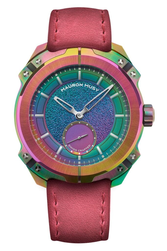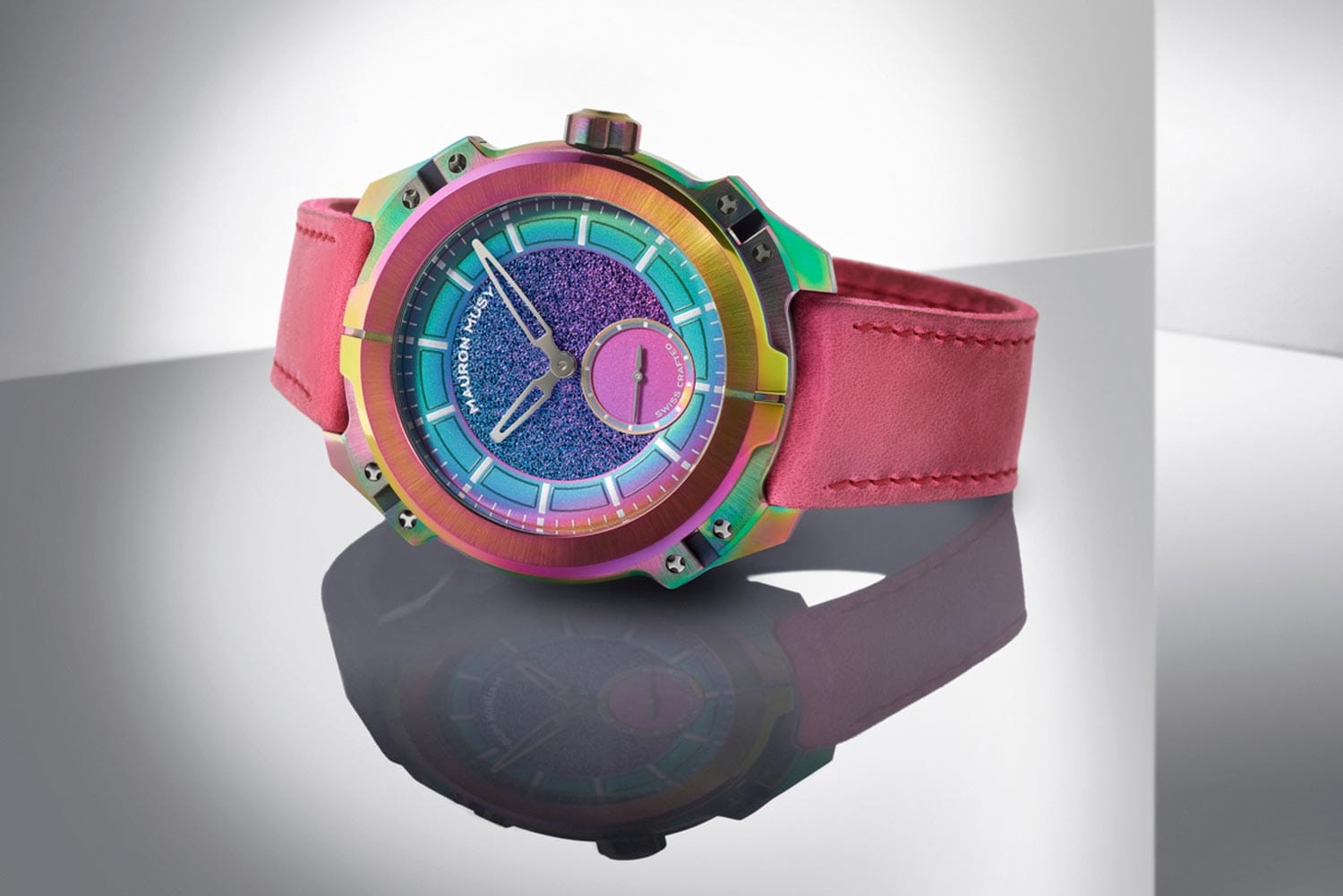 Mauron Musy is geen merk dat modestatements maakt. Liever werkt het aan inventieve uurwerken, zoals het MM02-kaliber, het eerste in-house microrotor-uurwerk van Mauron Musy. Het bevindt zich in de MU06 Mayura, maar hoe mooi het uurwerk ook is, dit horloge valt op door de kleur. Al is de kleurkeuze niet door de mode bepaalt, maar door de techniek. De titanium kast en andere componenten zijn voorzien van een coating om slijtage, oxidatie en krassen te voorkomen. Zijn kleur krijgt de MU06 Mayura als het materiaal tot extreem hoge temperaturen wordt verhit waarbij door de interactie met reactieve gassen een kleurverandering plaatsvindt. Door deze nauwgezette alchemie smelten technologie en esthetiek samen om een uniek horloge te creëren.