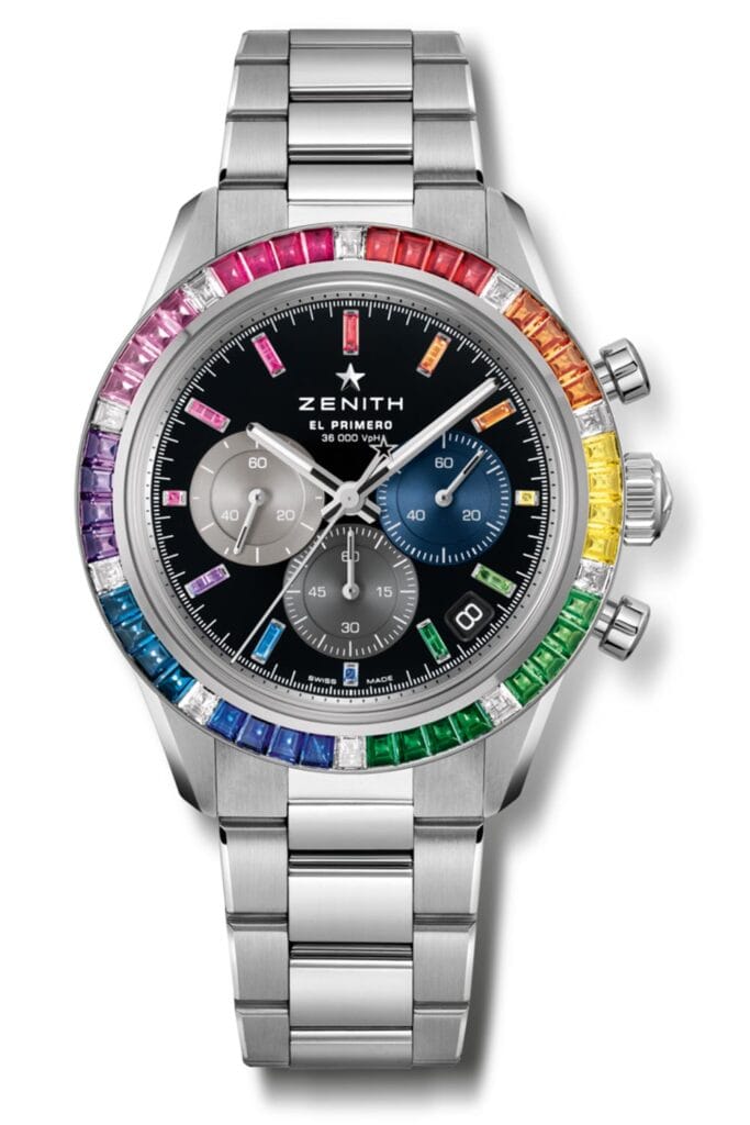 Sporthorloges en kostbare edelstenen klinken misschien niet als een natuurlijke combinatie, maar Zenith is erin geslaagd om de functionaliteit van zijn flagship chronograaf te combineren met een verfijnde artisticiteit, door deze te versieren met een schare kleurrijke edelstenen. Deze luxueuze en kleurrijke versie van de Chronomaster Sport bevat een El Primero uurwerk, in een witgouden kast die wordt bekroond door een lunette in ‘Rainbow’-stijl met vijftig baguette geslepen edelstenen. Om de stijl te verbeteren en tegelijkertijd de functionaliteit te behouden, wordt het kleurrijke palet van veertig saffieren onderbroken door tien baguette geslepen diamanten die de 10 seconden aangeven.