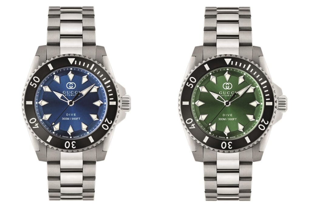De toegevoegde Gucci duikhorloges komen in vijf verschillende 40-millimeter uitvoeringen. Elk met een gedetailleerde wijzerplaat, versierd met het kenmerkende Interlocking G-motief van het huis. Het kastdeksel is voorzien van een gestempelde windroos om het nautische karakter van de horloges te benadrukken. Liefhebbers van het klassieke duikhorloge kunnen kiezen voor een model met groene of blauwe wijzerplaat met edelstalen band. De drie andere modellen, leverbaar met groene, blauwe of zwarte wijzerplaat, zijn voorzien van een rubberen band met Gucci-logo en tonen wat sportiever.