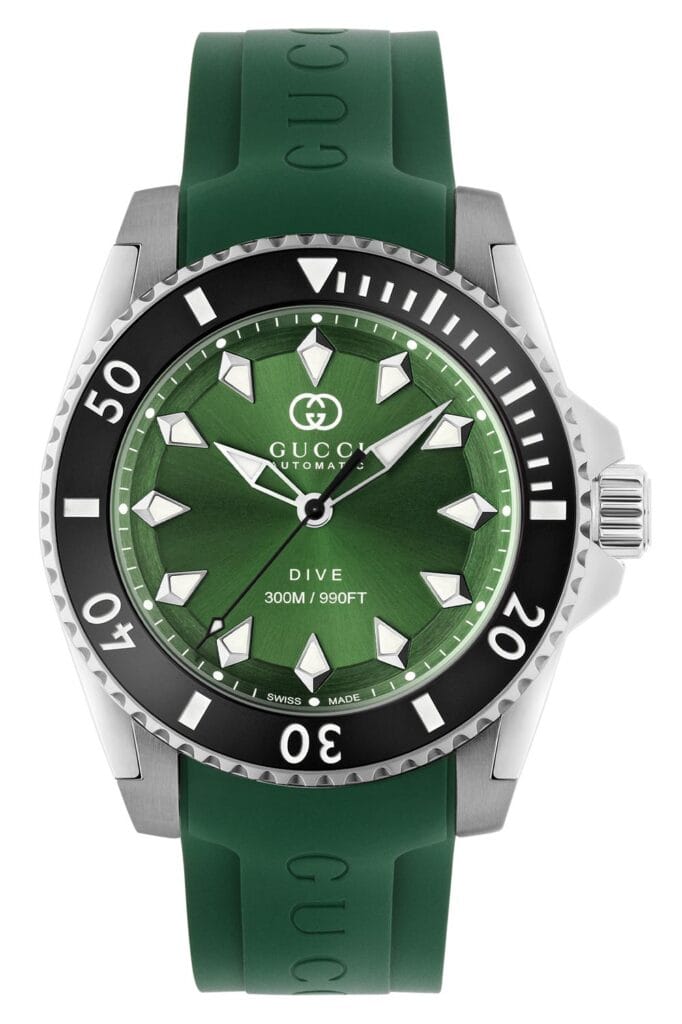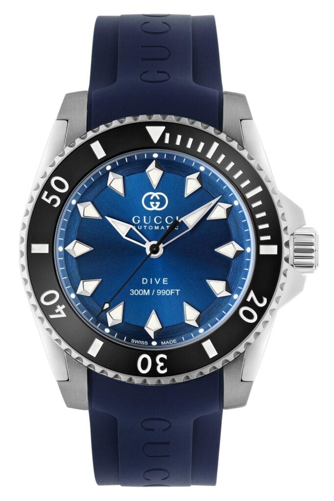 Gucci heeft zich gepositioneerd als een van de meest toonaangevende luxe fashionmerken. Door de Italiaanse flair van het huis te combineren met Zwitsers vakmanschap heeft inmiddels ook het Gucci-horloge een prominente plek veroverd. Het merk dat zowel luxe fashion- als sporthorloges presenteert, heeft met de introductie van vijf modellen een upgrade doorgevoerd binnen de Gucci Dive-lijn. De waterbestendigheid van deze Gucci Dive horloges is verhoogd naar 300 meter. Een unidirectionele zwarte keramische bezel biedt betrouwbare tijdregistratie onder water.