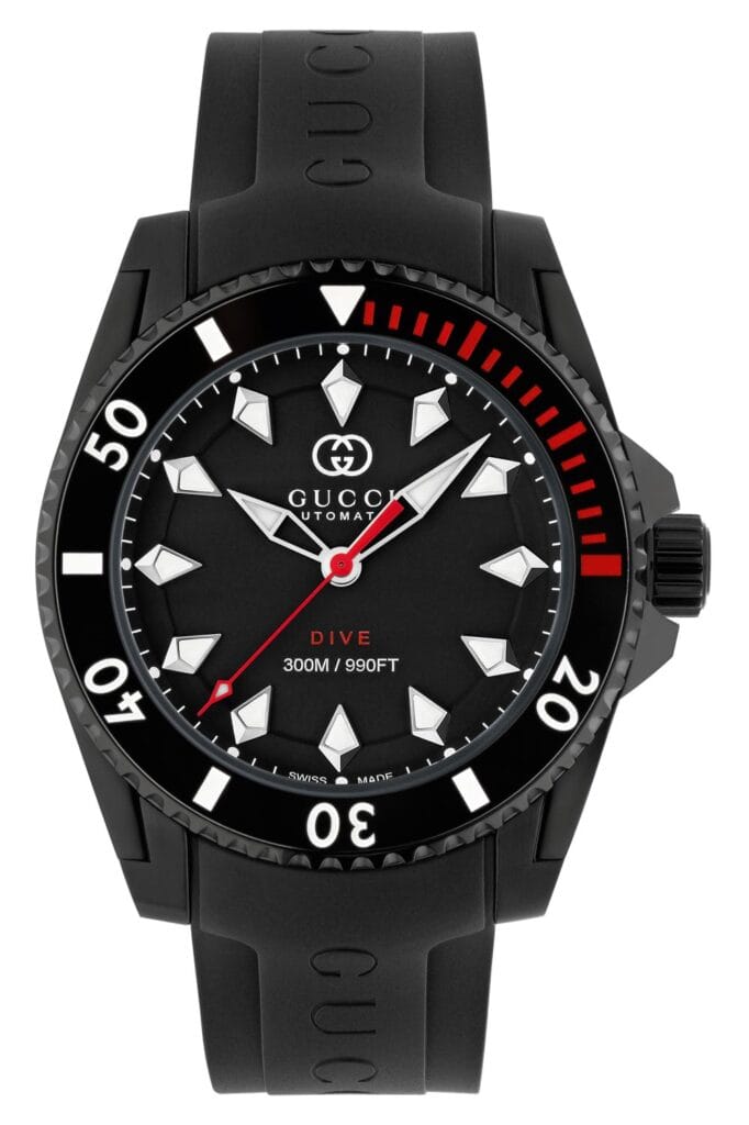 Het zwarte model toont het meest robuust, wat te danken is aan een zwarte PVD-coating in combinatie met rode details. Alle vijf Gucci Dive horloges worden aangedreven door een Zwitsers automatisch uurwerk met een gangreserve van 56 uur. Gucci duikhorloges zijn over het algemeen ontworpen met zowel stijl als functionaliteit in gedachten. Tot voorheen was een design gerichtheid op extreme duikomstandigheden wat ondergeschikt, zeker wanneer je ze vergelijkt met gespecialiseerde duikhorloges. Met de doorgevoerde aanpassingen lijkt Gucci dit te willen verkleinen.
