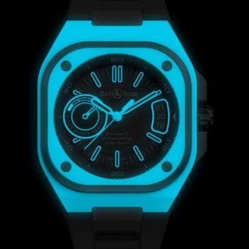De BR-X5 Blue Lum straalt een krachtige blauwe gloed uit met zijn volledig luminescente kast. Het model is een toonbeeld van hoe Bell & Ross het ontwerp tot het uiterste drijft voor een betere horlogeprestatie.