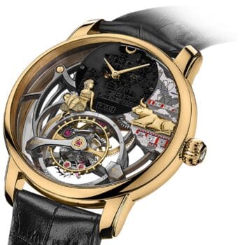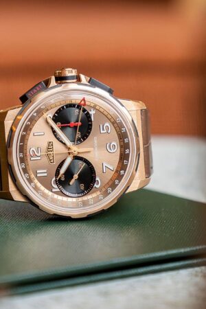 Het ‘geheim’ achter de bijzonder elegante wijzerplaat van de witgouden Arnold & Son Double Tourbillon Charoite Edition ligt al verscholen in de naam van het meesterwerk. De elegante en opvallende uitstraling is te danken aan
