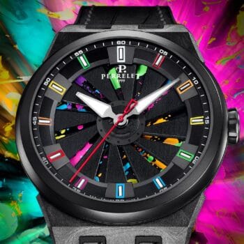 Met een onderste wijzerplaat die bestaat uit een explosie aan kleuren is de naam ‘Turbine Splash’, het nieuwste model van Perrelet, logisch gekozen. De kleuren fluoriserend groen, geel, paars, fuchsia, lichtblauw en oranje ‘spatten’ van