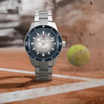Het nieuwste lid van de Rado Captain Cook-familie heeft naast de kenmerkende keramische bezelinzet en koepelvormige saffierglas een wijzerplaat met een blauw-wit verloop. Het sportieve horloge wordt geleverd met de keuze uit drie verschillende banden.