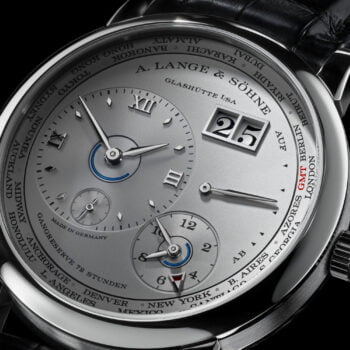 Wie vakantie viert of plannen maakt voor een verre reis, zal in de nieuwe Lange 1 Time Zone een perfecte reisgenoot vinden. Een reisgenoot die gezien mag worden met een platinum kast en rhodium wijzerplaat.