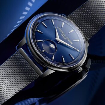 De geribbelde ring doet denken aan een muntstuk, maar het is de kast van de Classics Moneta Moonphase waarmee Frederique Constant het muntje opgooit. Het horloge met de opvallende kast is er nu in twee