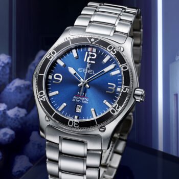De Ebel 1911 Marine met diepblauwe wijzerplaat, is een nieuwe toevoeging aan Ebels meest succesvolle collectie sporthorloges. Een ‘maritieme wijzerplaat’ van het duikhorloge wordt gecombineerd met een unidirectional bezel met zwarte, aluminium ring. Naast de