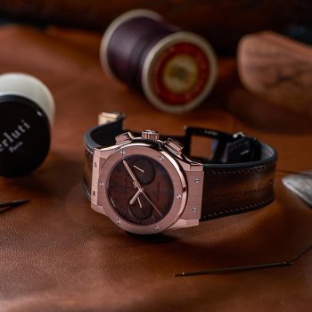 The new Classic Fusion Chronograph Berluti fuses Hublot's creative watchmaking genius with the innovative — and inimitable — patina of Berluti leathers. The new Classic Fusion Chronograph Berluti is available with a 45 mm case in a choice of two finishes, Scritto King Gold and Scritto All Black.