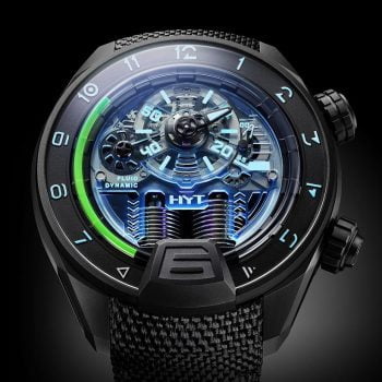 Innovation within tradition, the DNA of haute horlogerie, the movement heritage, and so on: forget it all. Need a known quantity to hang on to? Good news: the H4 Neo tells the time. The H4 Neo is a piece equipped with a light source. Under the dome at 6 o’clock, HYT has concealed two purple LEDs. Once activated, they flood the entire dial with light.