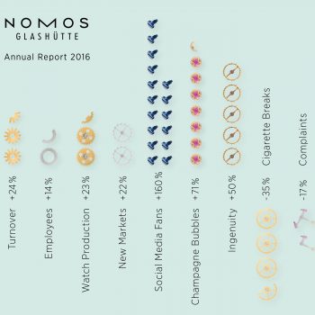 More watches made. more turnover, more fans on social media, everything's on the rise at Nomos Glashütte as we can see in their quirky 2016 report. Well, not everything. Cigarette breaks are down substantially, but that's a big up too.