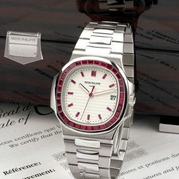 This Patek Philippe Ref. 5711 Jumbo Nautilus in platinum with rubies is anything but an average Nautilus - if such a thing existed. This version is in the Patek Philippe books as Ref. 5711/112P-010. This