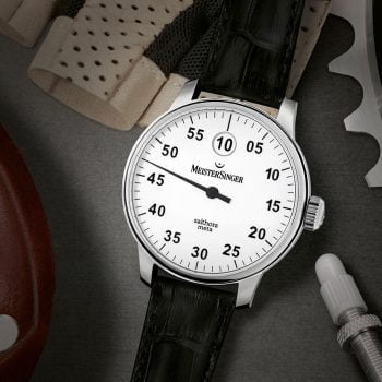 The principle of the single hand is firmly upheld in the MeisterSinger Salthora Meta and yet, there is something different about the watch. In this sporty-looking model the single hand does not function as a solitary, universal time indicator but as a dedicated minute hand, as the hours are presented digitally in a display at 12 o'clock. When the minute hand reaches the centre of this window the next hour flashes up.