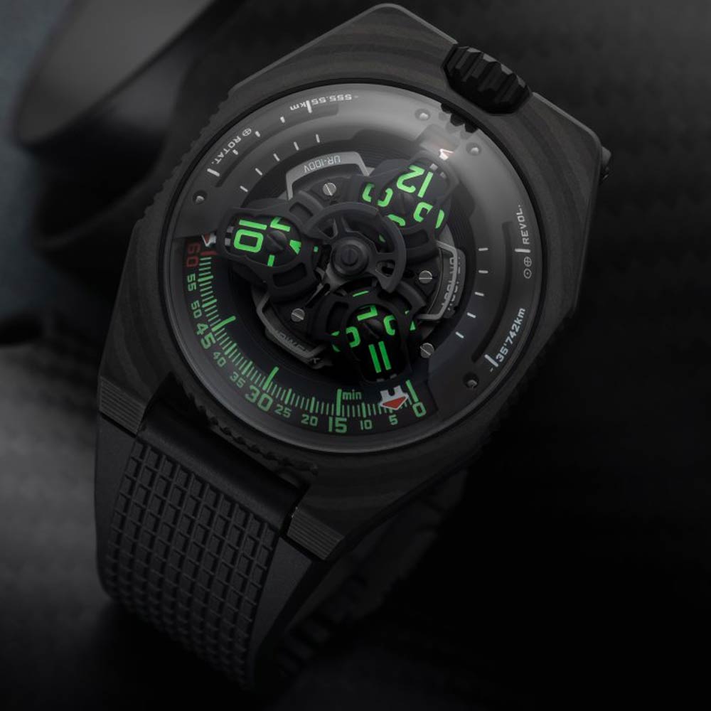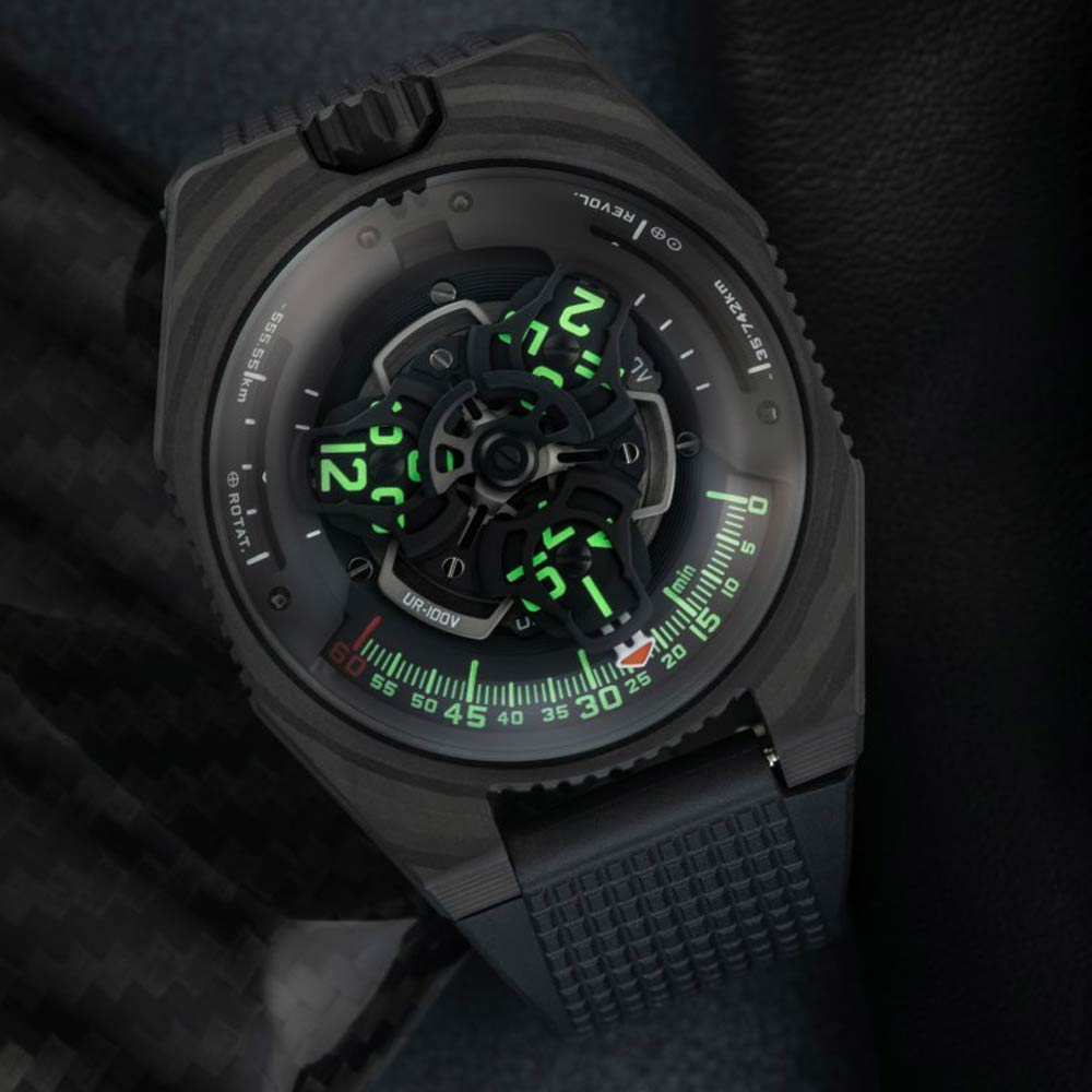 Geloof het of geloof het niet, maar deze zweverige visie leidt al decennialang tot bijzonder knappe horloges, waaronder deze brand nieuwe UR-100V C52. Het horloge wordt gekenmerkt door drie kernwoorden: lichtgewicht, prestatie en esthetiek. De behuizing is samengesteld uit 52 lagen ultradun High Resistance CTP Carbon.