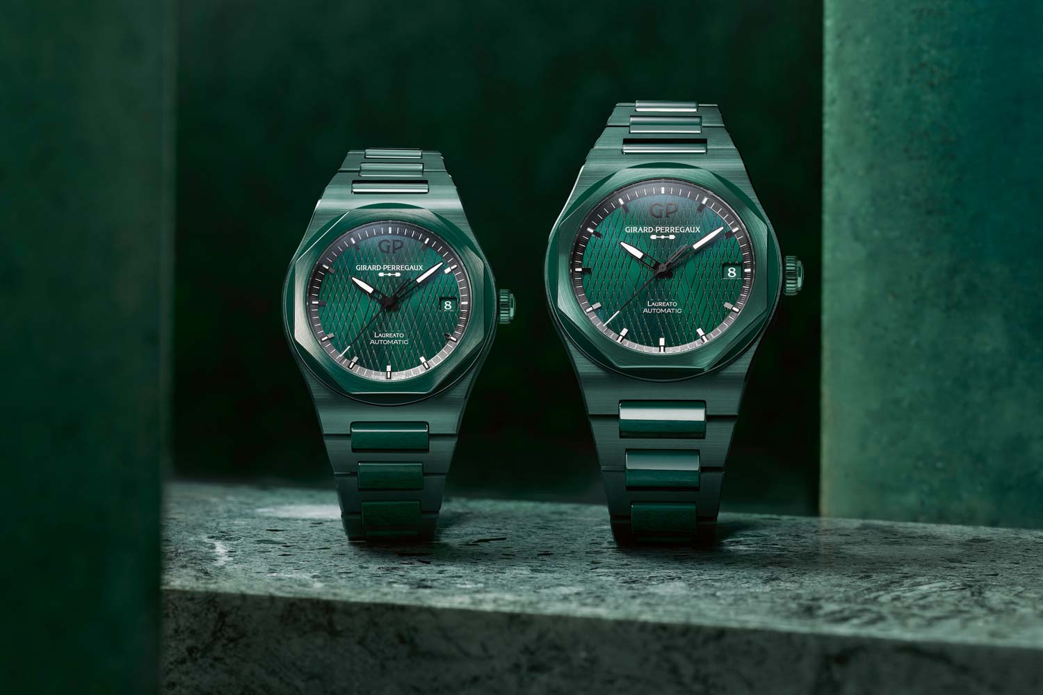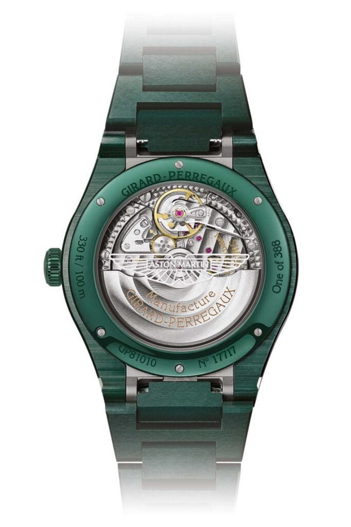 De Girard-Perregaux Laureato Green Ceramic Aston Martin Edition wordt aangeboden in twee kastformaten – 42 mm en 38 mm – en is gelimiteerd tot respectievelijk 388 en 188 exemplaren. Door de saffierkristallen achterkant is door het gevleugelde Aston-logo heen te zien hoe de automatische in-house kalibers GP01800 en GP03300 hun werk doen. De modellen liggen vanaf juni 2023 bij de geselecteerde dealers, voor prijzen van om en nabij € 26.000 – € 27.000. Dat is beduidend meer dan een basis-Laureato, maar vele malen minder dan een échte Aston Martin…