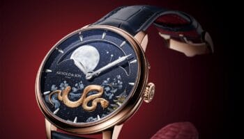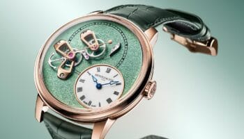Het ‘geheim’ achter de bijzonder elegante wijzerplaat van de witgouden Arnold & Son Double Tourbillon Charoite Edition ligt al verscholen in de naam van het meesterwerk. De elegante en opvallende uitstraling is te danken aan charoiet, een zeldzame edelsteen met een paarse kleur. Het merk gaat daarmee verder op het pad van uniek materiaalgebruik binnen de Double Tourbillon-familie.