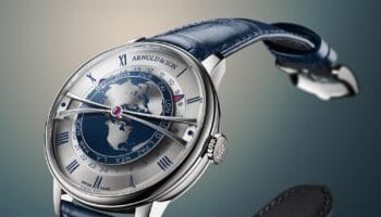 De Arnold & Son Double Tourbillon Charoite met 43,5 millimeter witgouden kast beschikt over het A&S8513-kaliber met twee tourbillons, twee kronen en twee tijdzones. In tegenstelling tot andere horloges kan dit model ook tijdzones weergeven die afwijken met 15, 30 of 45 minuten. Historisch gezien volgt het ontwerp de focus van John Arnold op precisie. Het horloge toont twee tijdzones: de lokale tijd op 12 uur met Romeinse cijfers, en een tweede tijdzone op 6 uur met Arabische cijfers. Beide zones zijn onafhankelijk en zeer nauwkeurig. Het uurwerk heeft verfijnde details zoals Côtes de Genève-patronen en gesatineerde tandwielen. De witgouden tourbillonbruggen zijn met de hand gepolijst en afgeschuind.