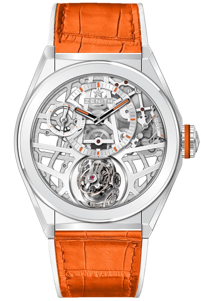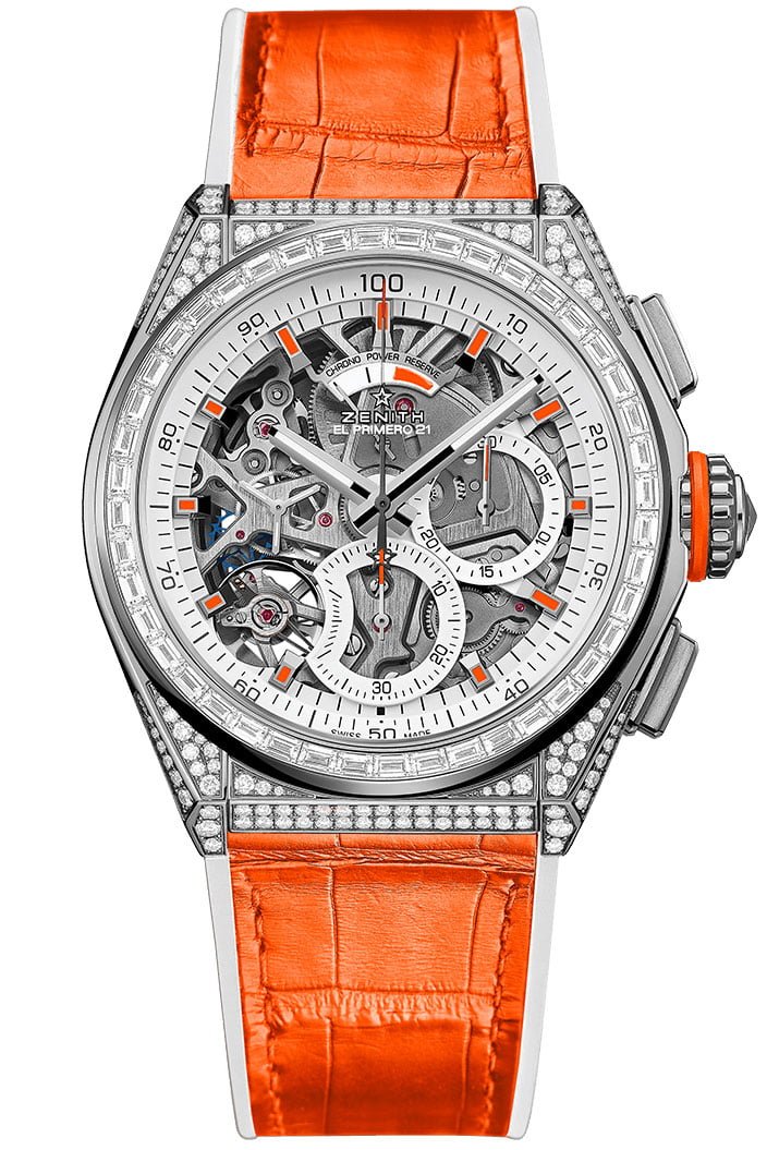 The three limited editions consist out of a Defy Zero G, featuring a titanium case and orange details on the hands and hour markers. Just as the rest of the watches is it fitted with a white rubber strap with an orange alligator leather coating. The next two watches are both Defy El Primero 21s, of which one has a case made out of white gold and set with brilliant cut diamonds.