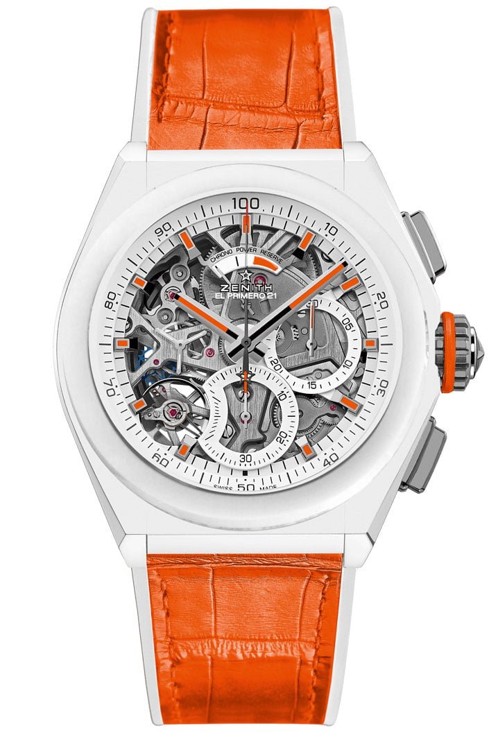 While this is a true eyecatcher, it is the third version that naturally also grabs a lot of attention. It is also a Defy El Primero 21, yet now with a white ceramic case, which really sets off against the orange details on the dial as well as the strap. While individually available a select few will also be for sale as a set with matching serial numbers.