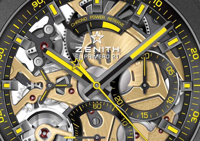 This time, The Swiss watch Manufacture Zenith is presenting a new special edition of the revolutionary Defy El Primero 21. Launched at Baselword 2017, the Defy El Primero 21 stems from modern engineering, all designed to ensure simplified assembly and adjustment serving to achieve the finest level of performance and certification. The world’s most accurate series-made chronograph in 1969 entered in a whole new era with a frequency that reaches an impressive 360,000 vibrations/hour ensuring its hundredth of a second precision, and energy consumption is ten times higher than in the original. From tenths to hundredths of a second, a quantum leap in terms of performance and engineering. To avoid any risk of the chronograph interfering with the smooth running of the watch, the Defy El Primero 21 is therefore equipped with two independents “gear boxes”: one for the time (36,000 VpH – 5 Hz) and the other for the chronograph (360,000 VpH – 50Hz). Each has its own transmission and escapement system and there is no coupling clutch. Alongside its integrated construction, its double-chain architecture and the remarkable chronometric performance, the El Primero 21 movement features a patented chronographreset control mechanism composed of three heart pieces and an exclusive starter mechanism, ensuring simultaneous resetting of the seconds as well as tenths and hundredths of a second.